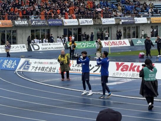 互角の展開でそれぞれ決定機を逃した前半。後半は押され気味でしたが、お互いの選手交代の後くらいから互角の展開に。残り時間を見てスコアレスがちらつく中、CKから千両役者・杉本の2発! 終わってみれば2-0のクリーンシートで勝利となりました!