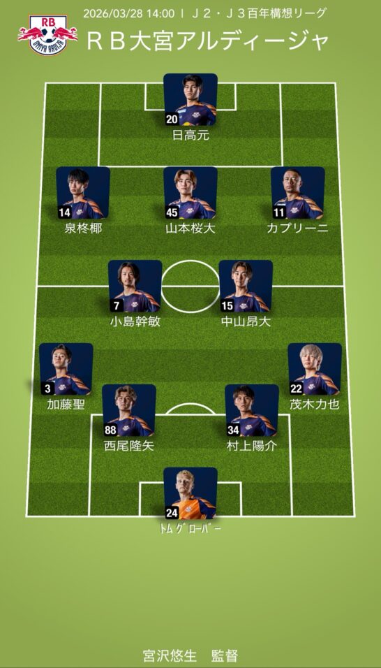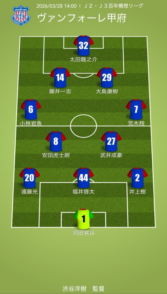 甲府2026.03.27A甲府戦予想布陣:期限付き移籍中の藤井&福井先発? ヴァンフォーレ甲府戦のフォーメーションを予想しました。。 目次ヴァンフォーレ甲府・予想スタメンRB大宮アルディージャ・予想スタメン管理人のひとこと ヴァンフォーレ甲府・予想スタメン 安田が出場停止から復帰。前節布陣を継続でしょう。 RB大宮アルディージャ・予想スタメン こちらも継続。ガブも無理させずに村上先発と予想。 管理人のひとこと 所沢栗鼠 期限付き移籍中の選手と対戦するとはね…。
