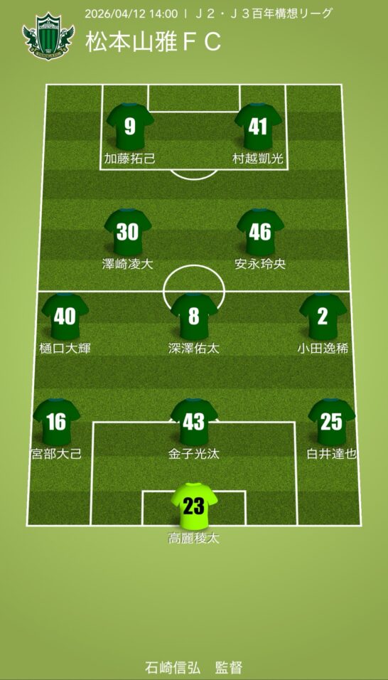 松本2026.04.10A:松本戦予想布陣:お互い前節と同じ? アウェイ松本山雅FC戦のフォーメーションを予想しました。 目次松本山雅FC・予想スタメンRB大宮アルディージャ・予想スタメン管理人のひとこと 松本山雅FC・予想スタメン いわき相手にPK戦にまで引っ張った布陣を変えるとは思えない。前節と同じはず。 RB大宮アルディージャ・予想スタメン 今回は前節の先発継続と予想。 管理人のひとこと 所沢栗鼠 熱い戦いになりそう。