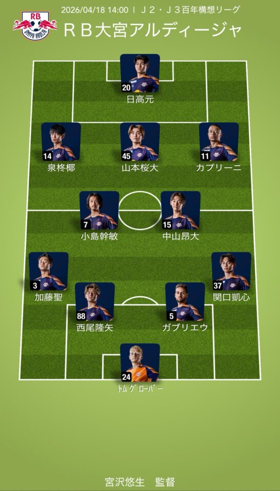 磐田2026.04.17H磐田戦予想布陣:どう変えるか。 ジュビロ磐田戦のフォーメーションを予想しました。 目次ジュビロ磐田・予想スタメンRB大宮アルディージャ・予想スタメン管理人のひとこと ジュビロ磐田・予想スタメン おそらく変更なし。 RB大宮アルディージャ・予想スタメン 村上→ガブ、サンデー→日高と予想。 管理人のひとこと 所沢栗鼠 さすがにトム継続とは思うが…。